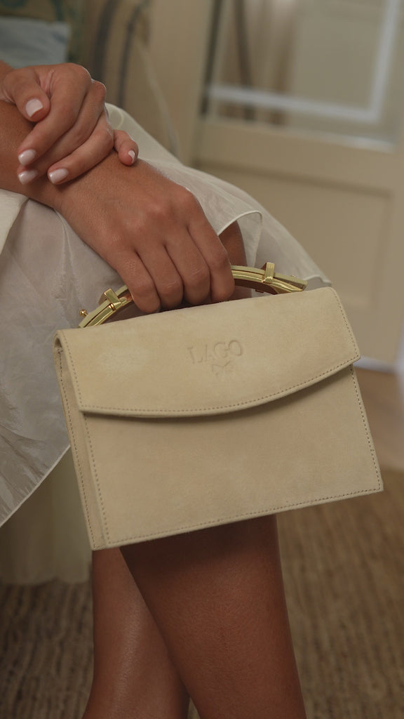 A classy yet contemporary handbag, Charlotte is perfect for any occasion. Handcrafted with soft suede, it has a lady-like design, metallic handle and fastens with a hidden press stud.